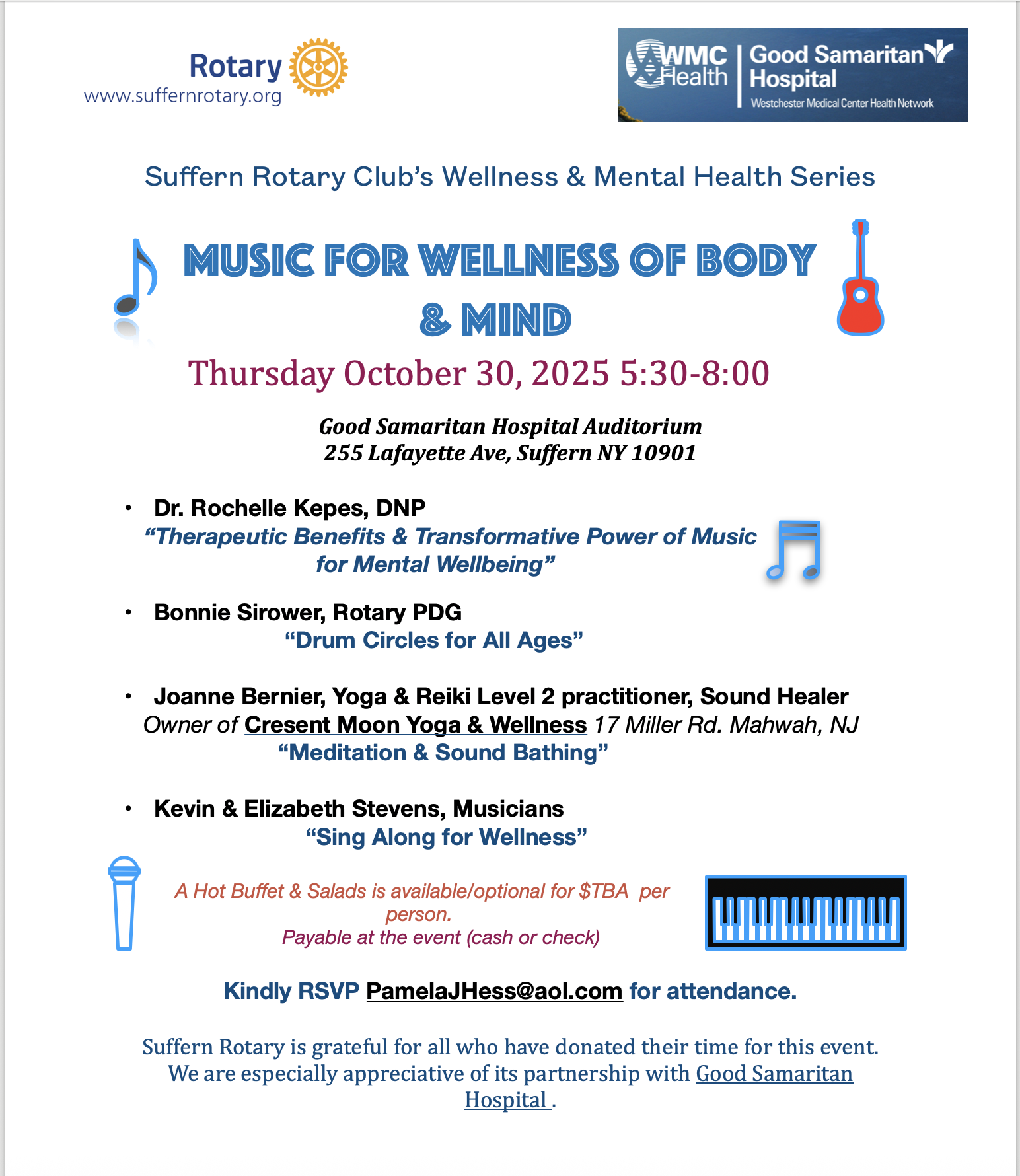 The Suffern Rotary Action Plan for Wellness is to bring attention to the importance of wellness to include good mental health. We seek to remove the stigma of discussing the relationship between wellness and mental health, to inform on important mind-body connections, self care skills as well as provide information on resources for support.